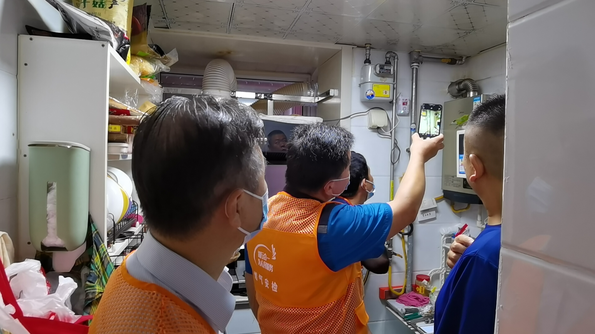 进行了短暂的工作交代后,能投集团与港华燃气的党员志愿者与安检工作人员一起,三人一组分别来到用户家中,为用户更换燃气不锈钢波纹管。