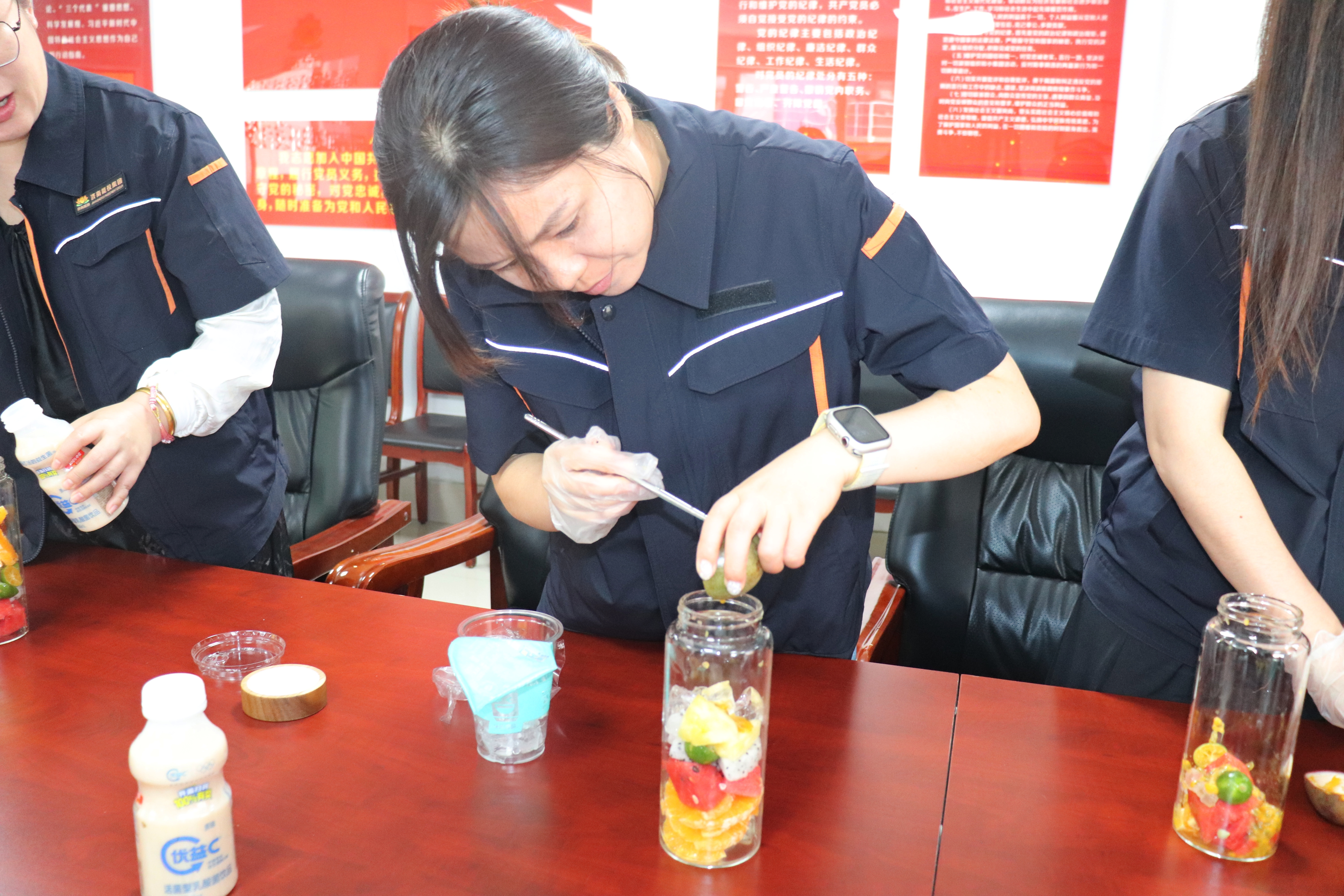 活动伊始,首先向大家展示了父亲节的历史和内涵。其中,钟南山铭记父亲“为社会留痕”家训担起医者使命的故事,让在场职工感触尤为深刻。带着这份涌动的情感,职工们开始了果茶制作环节。职工们挽起袖子,跃跃欲试。有的捣碎百香果和小青柠,调出酸甜口感;有的将西瓜切块与菠萝丁榨汁,搭配青桔片增加清爽感;有的还将多种水果分层叠加,加入蜂蜜、冰块后摇匀,将对父亲的爱融入手中的水果茶里。