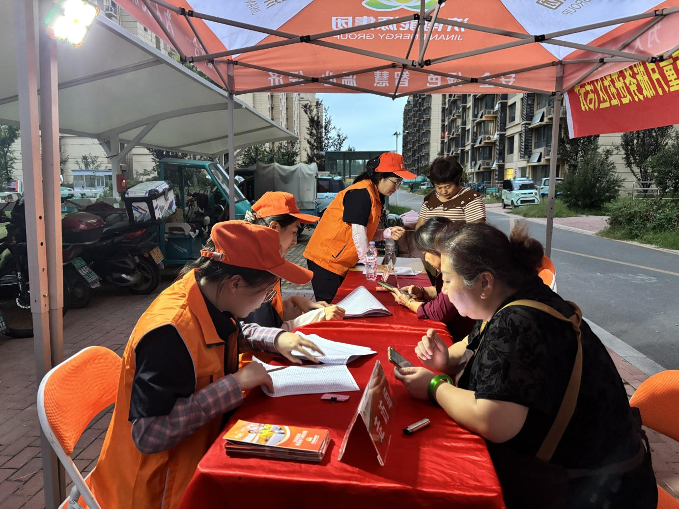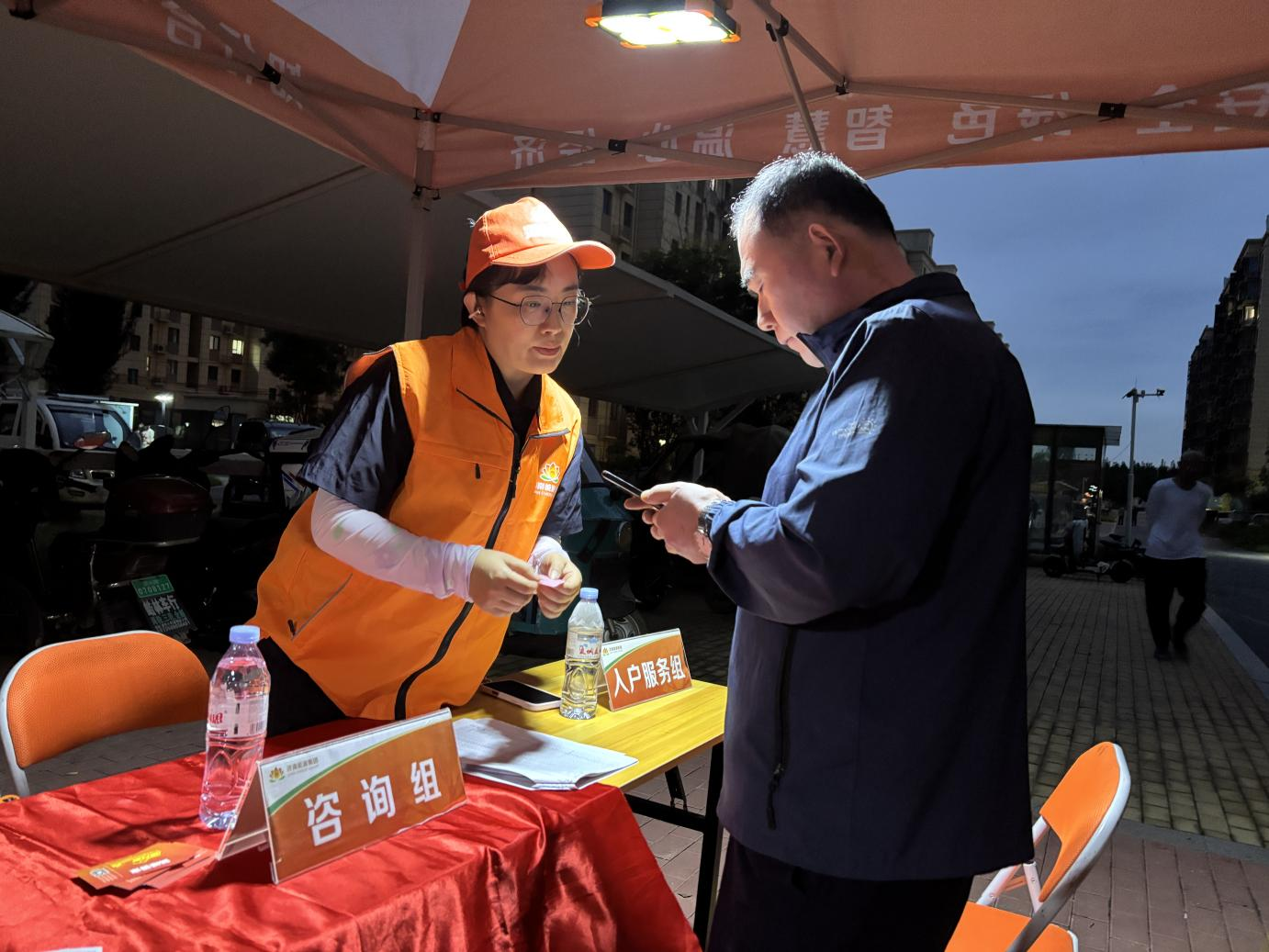 夜色渐深,社区里的灯光愈发柔和,收费员依旧热情满满地为居民办理业务。“暖心在身边!”即使天色已晚,他们依然坚守在岗位上,只为给晚归的居民提供便利服务。他们用贴心举动驱散夜晚的凉意,让温暖在社区流转。