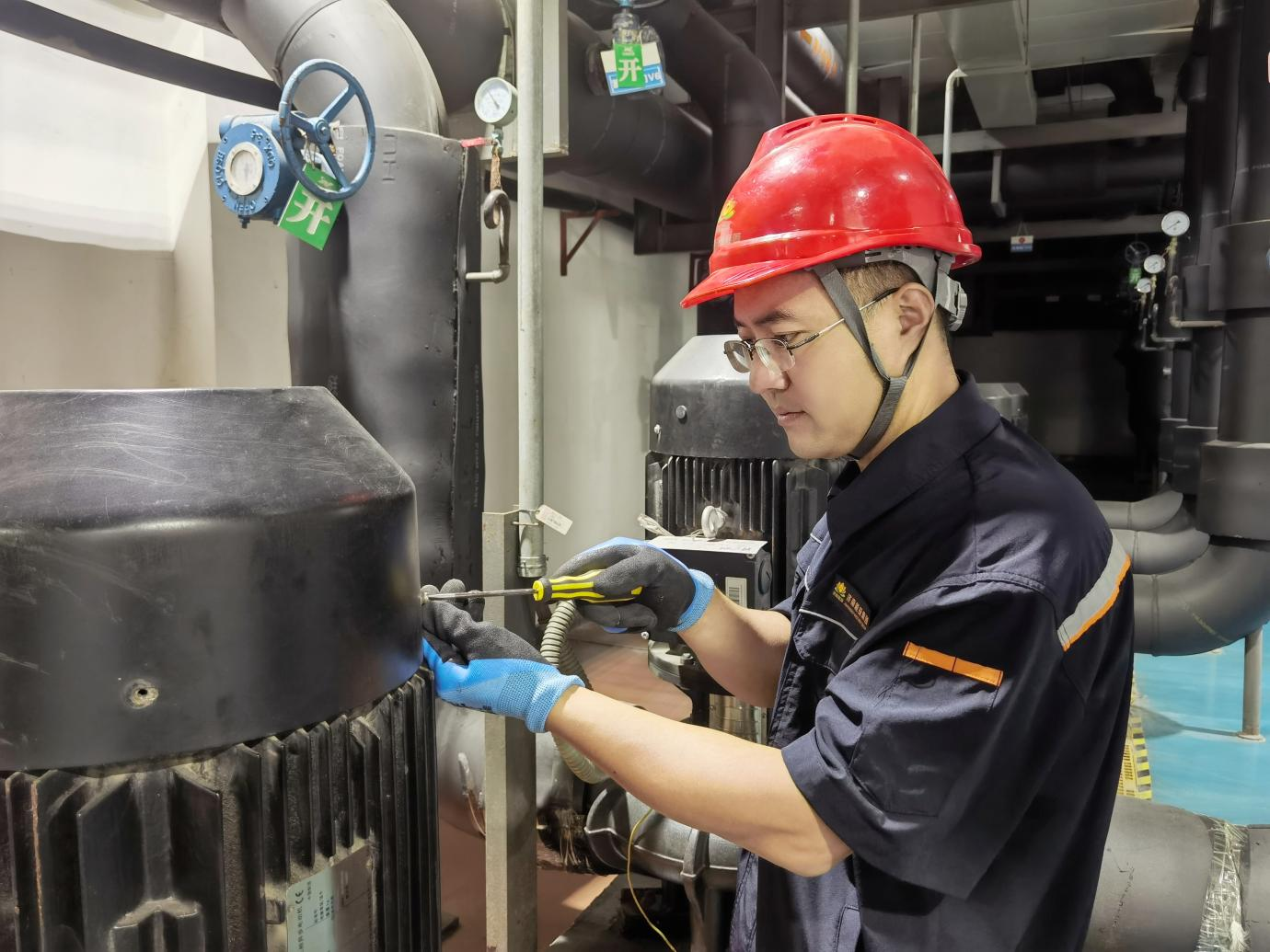 夜幕降临,社区渐渐归于宁静,能源站站长背着检修包,身影坚定地走向工作岗位。在能源站内,他们细致检查设备、排查隐患,用行动践行“坚守有担当”的誓言。从设备维护到应急响应,他们的坚守让居民冷暖有了保障,也让国庆夜晚更添安心。