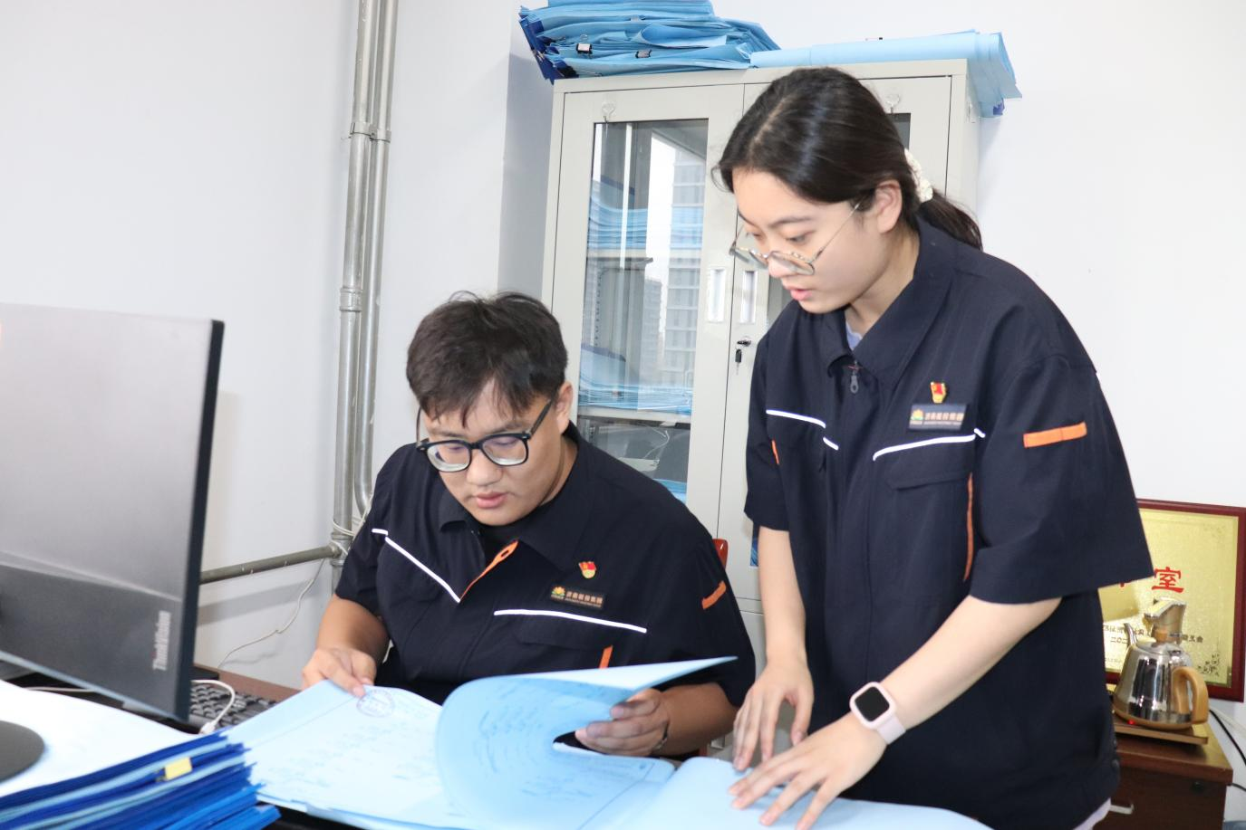工程管理部,两名职工围在施工图纸前,或低声讨论技术细节,或用笔标注关键节点。“发展有方向!”他们假期里为项目推进、技术优化忙碌,以专业素养为公司长远发展积蓄力量。